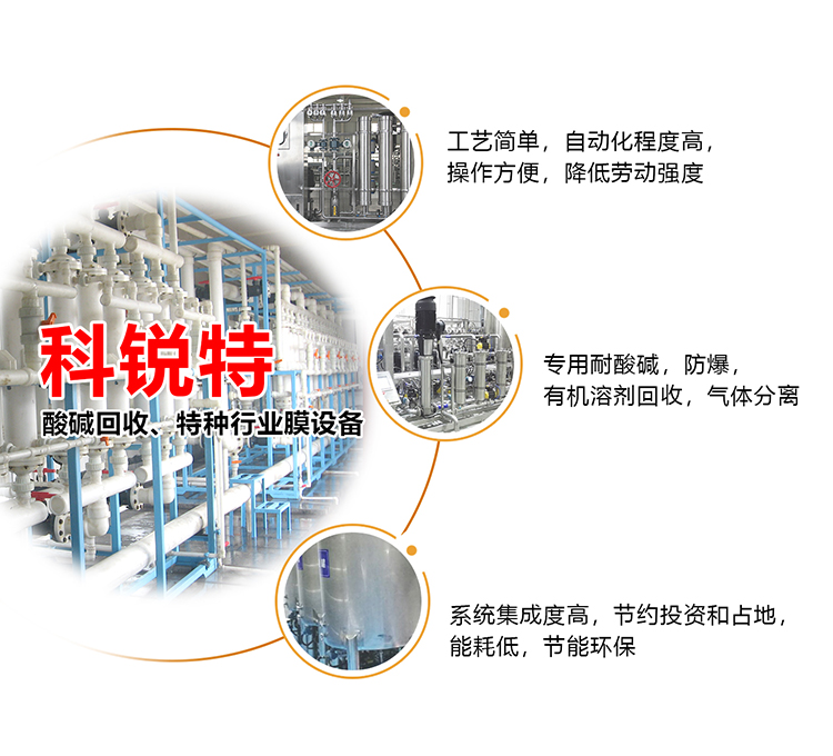 工業(yè)生產(chǎn)中經(jīng)常有廢酸、廢堿產(chǎn)生,排放時(shí)造成資源的浪費(fèi),同時(shí)嚴(yán)重污染了環(huán)境,科銳特研發(fā)的專(zhuān)用耐酸、堿的膜設(shè)備,可以將廢酸、堿中的雜質(zhì)去除,使酸、堿達(dá)到純化回用到生產(chǎn)中,不但節(jié)省了大量的酸和堿的用量,同時(shí)減輕了環(huán)境污染壓力。具有節(jié)能、降耗、占地面積小,操作簡(jiǎn)便等特點(diǎn),因此膜技術(shù)在化工產(chǎn)品精制方面具有很好的作用。