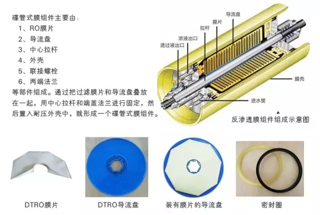 碟管式膜組件主要由RO 膜片、導(dǎo)流盤(pán)、中心拉桿、外殼、兩端法蘭各種密封件及聯(lián)接螺栓等部件組成。把過(guò)濾膜片和導(dǎo)流盤(pán)疊放在一起,用中心拉桿和端蓋法蘭進(jìn)行固定,然后置入耐壓外殼中,就形成一個(gè)碟管式膜組件。